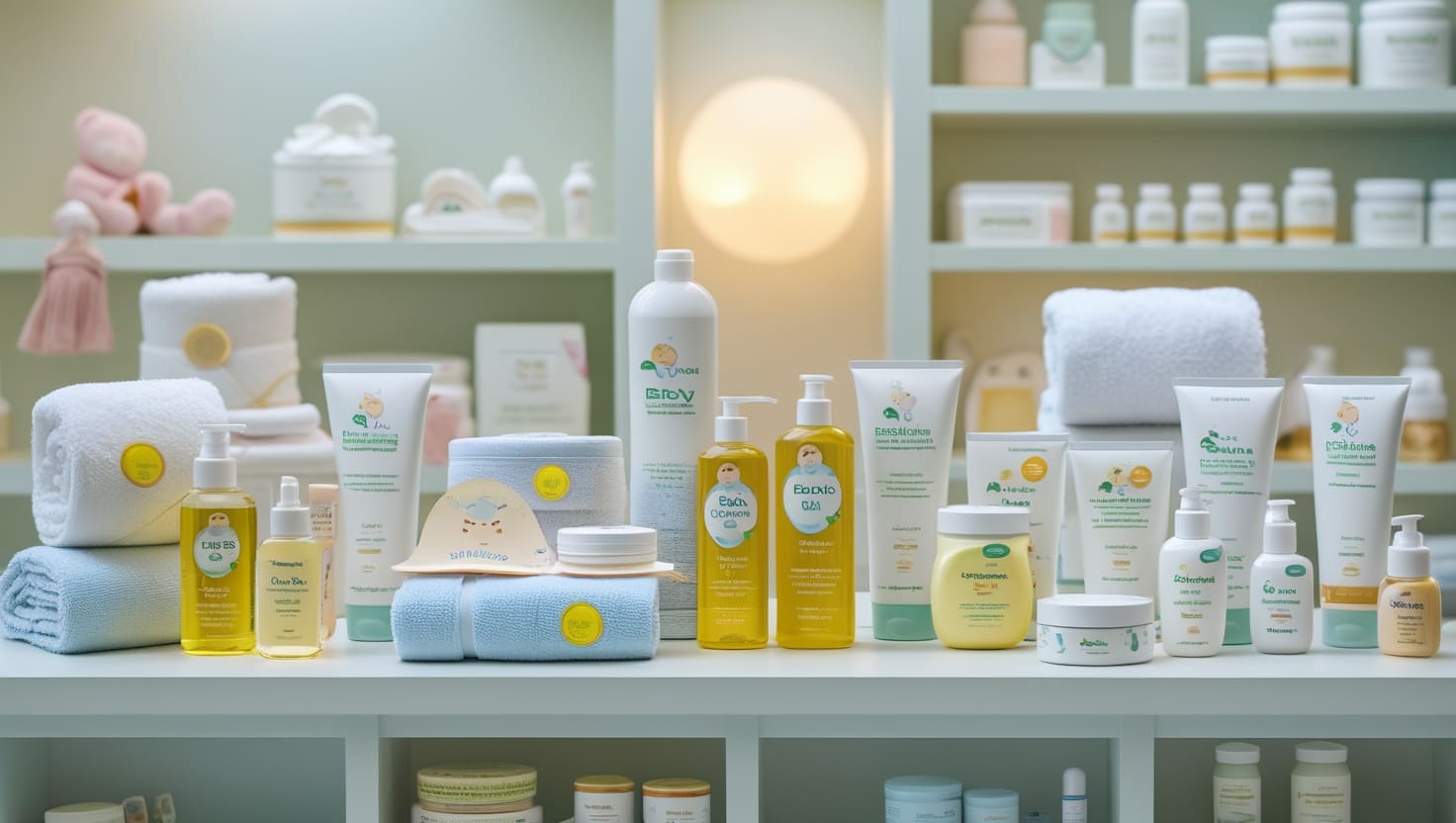 Mild soaps, shampoos, body lotions, massage oils, and powders specially formulated for delicate baby skin.